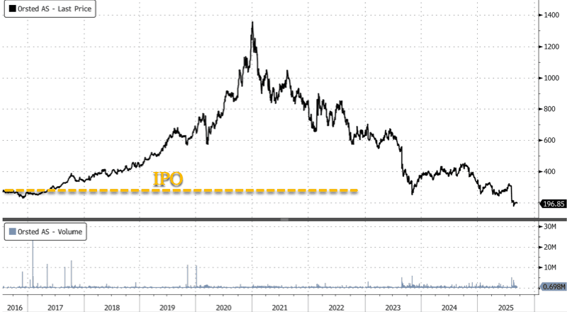 Well, it's a combination of Orsted shares crashing in Copenhagen on news of the rights offering last month, the Trump administration freezing construction of its Rhode Island offshore wind project, and the broader unraveling of the globalist/Democrats' green energy bubble: