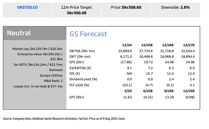Orsted has just announced the intention to carry out a DKK 60 bn rights issue (c.€8 bn), equivalent to around 45% of its market capitalisation. Although not totally unexpected to us – in our recent report (here), we flagged execution risks on disposals and FCF headwinds from rolling incentives – we believe this would come as a surprise to most of the Sell Side. Given the size, the rights issue would be highly dilutive, and hence we believe could lead to a swift drop in the share price. We also note that we have not seen the terms of the rights issue, and the terms (based on the H1 investor presentation available on Orsted website) would be disclosed in the first half of September, thus implying 3-4 weeks of market uncertainty. On the other hand, we highlight that once completed, this would most likely represent a "clean up move" as we would expect the resulting B/S (post rights issue) to be solid. As a reference, consensus YE Net Debt currently stands at DKK 75 bn on Bloomberg, and we project 2025 EBITDA at DKK c.28 bn. A restored B/S strength would put less pressure on Orsted to divest assets (current plan implies DKK 40 bn pending disposals). Lastly, we also flag that, pre raise, Bloomberg consensus P/E for 2026 is a mere 12x; the stock would therefore not be on an overly high P/E even post rights. We remain Neutral rated.