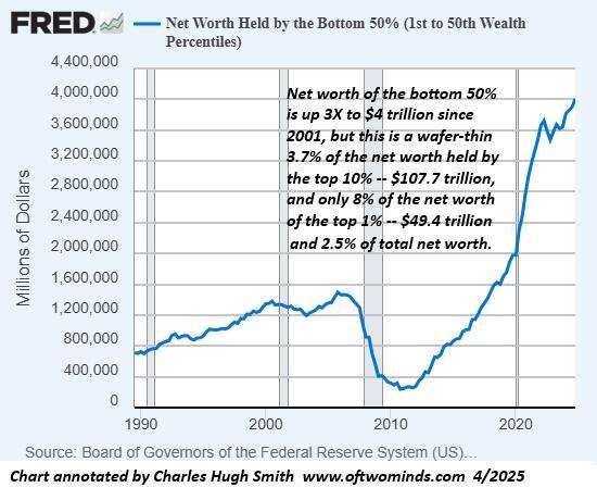 I submit that the United States is in the firm grip of the single-minded few focused solely on maximizing their gains and distributing costs and losses to others by any means available. The social and political restraints that placed modest limits on the aggregation of power and wealth into the hands of the few have crumbled, and this structural collapse has been hidden behind flimsy billboards hyping the latest in distractions: AI, tariffs, stablecoins, Rich Mom fashions, etc.