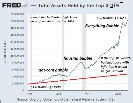 But all bubbles pop, and there are no tricks left to fund both the greed of the few and the needs of the many. The top 0.01% own five times as much as the bottom 50%--170 million Americans. That's some very pretty entropy dressed up as stability.