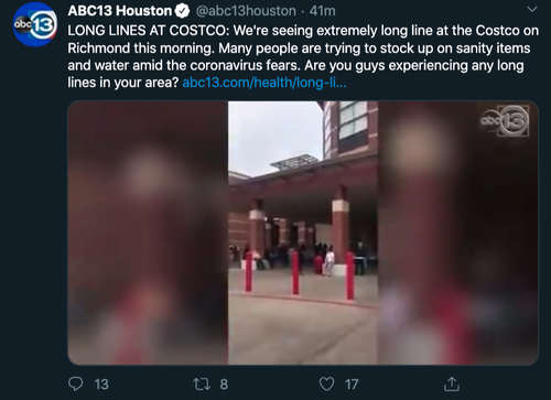 ABC13 Houston reported, "We're seeing extremely long line at the Costco on Richmond this morning. Many people are trying to stock up on sanity items and water amid the coronavirus fears."