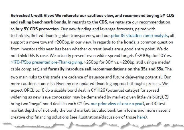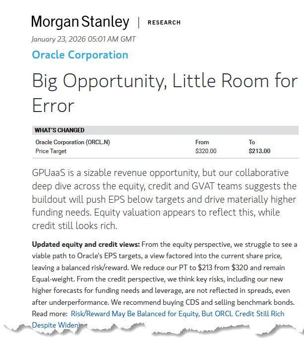 First, it was Morgan Stanley's analysts (here for pro subs) with a major cut to their ORCL price target. The reason: "GPUaaS is a sizable revenue opportunity, but our collaborative deep dive across the equity, credit and GVAT teams suggests the buildout will push EPS below targets and drive materially higher funding needs. Equity valuation appears to reflect this, while credit still looks rich."