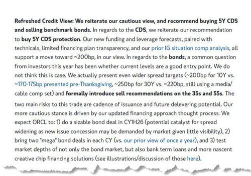 ... and sure enough, for the next month or so, Oracle CDS tightened rather notably. However, we certainly did not expect the company to just sit there and do nothing, as the market started asking questions again about where the tens of billions in committed funding would come from. After all, we were the first to lay out back in November the case why Oracle CDS should be trading much wider than it was at the time (see "Oracle Is First AI Domino To Fall After Barclays Downgrades Its Debt To Sell.")