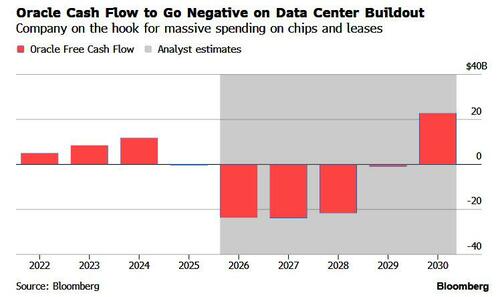 Developing AI data centers - without concurrently collecting cash from its clients - has pushed Oracle’s free cash flow negative, where it is expected to stay until 2030. As a result of its terribly structured deals, the company is on the hook for tens for billions of dollars in spending in the coming years, largely on semiconductors and leases.