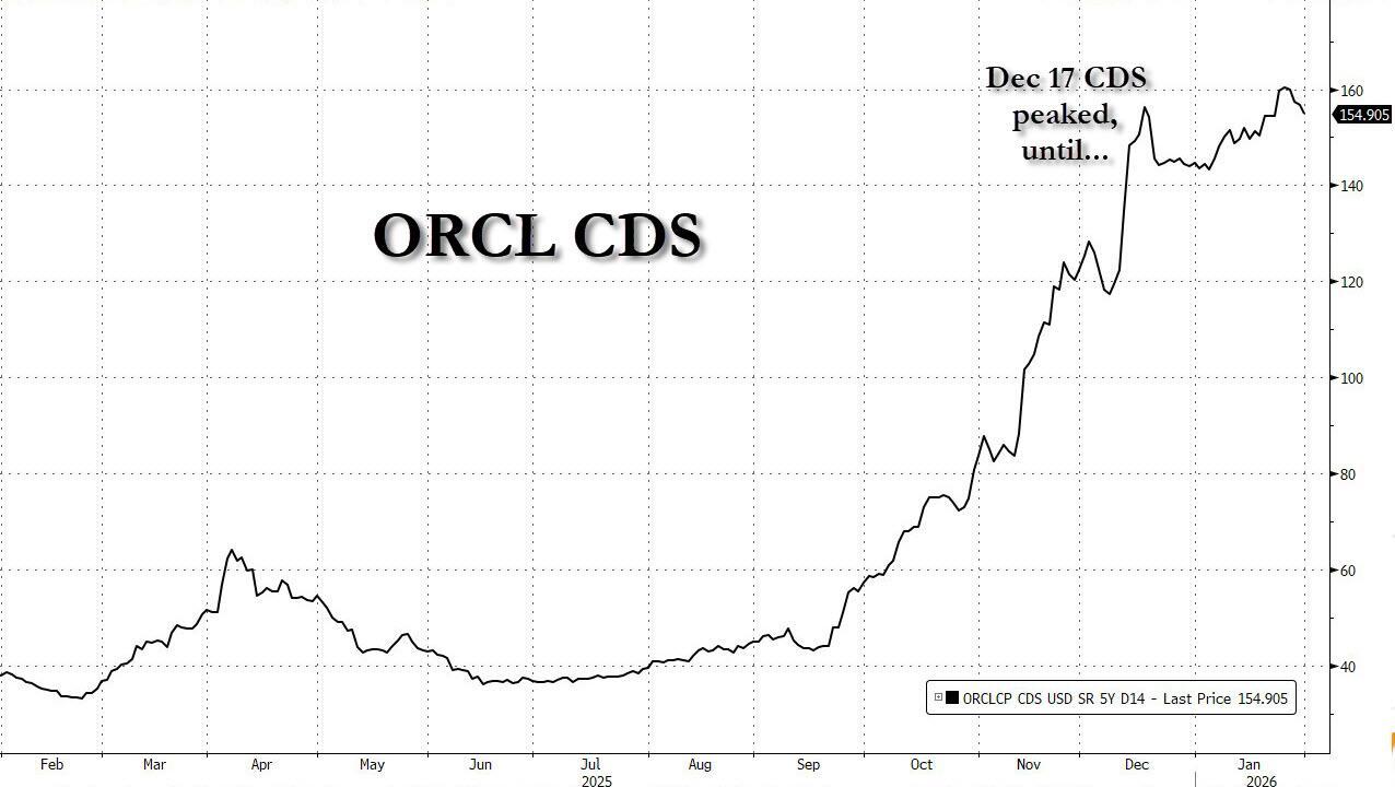 Just over a month ago, on Dec 17, alongside the news that Abu Dhabi was set to invest billions in OpenAI thus preventing a year-end tech rout, we said that ORCL CDS - which on that day hit the widest level since the 2008 financial crisis at 156bps - "may have gone a bit too far"...