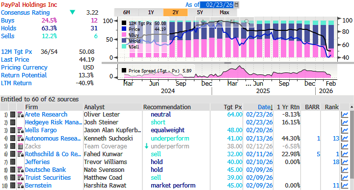 Bloomberg notes a leadership shakeup of the firm is underway, with board chair Enrique Lores set to become president and CEO on March 1, following the ouster of Alex Chriss earlier this month. The latest earnings have disappointed, with quarter four profit and revenue missing estimates and signs of a continued slowdown in payment volume.