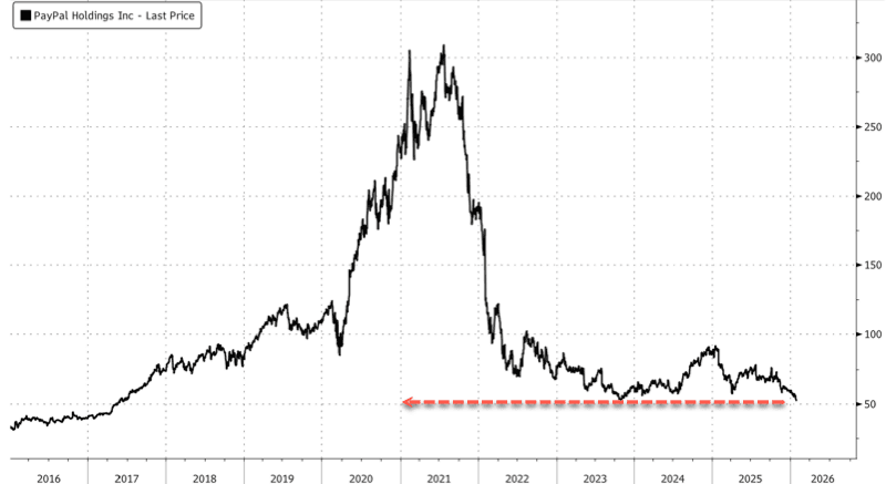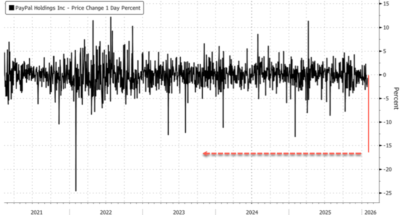 PayPal shares in New York premarket trading plunged 17%. If the losses hold through the cash session, this would mark the largest decline in four years. The selloff was sparked after the payments company reported adjusted profit and revenue that fell short of Bloomberg Consensus estimates, along with news that CEO Alex Chriss will be replaced.