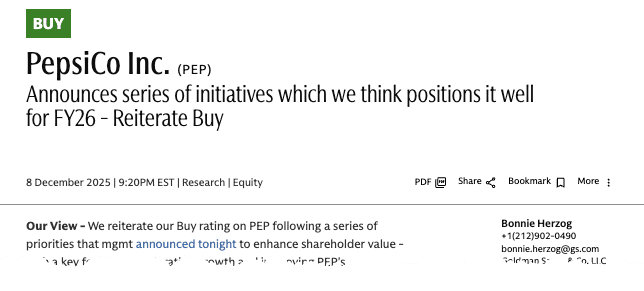 Herzog noted, "Although many of these initiatives are not necessarily new—and some have been underway for a while now (i.e. sharper value, accelerated innovation pipeline, etc.)—we're encouraged by mgmt's transparency and the clear set of steps that mgmt can take to accelerate growth going forward. As such, we continue to think PEP is set to enter '26 from a stronger position—and therefore we continue believe PEP has one of the most positive risk-reward profiles within broader staples heading into '26, especially given its attractive valuation, particularly relative to KO & PG."