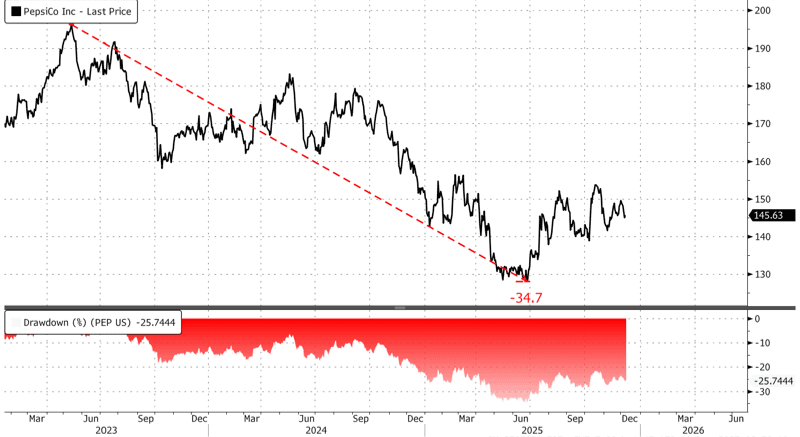 In markets, Pepsi shares remain locked in a bear market, down about 25% from their 2023 peak, though that's an improvement from the roughly 35% drawdown seen this past summer.