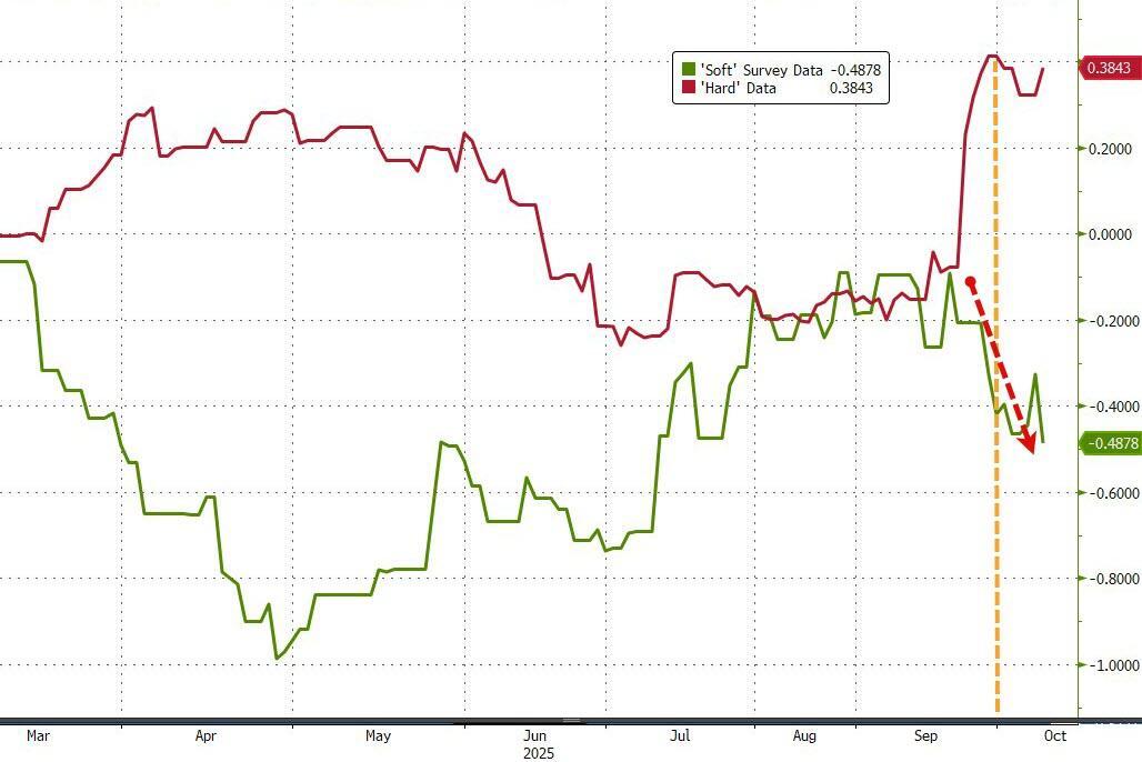 Finally, since the shutdown began, what little hard data we have seen is basically flat while soft survey data has deteriorated significantly...