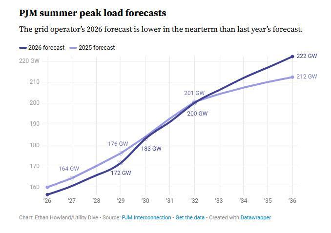 The PJM Interconnection scaled back its load growth forecast through 2032 compared to last year’s estimates, but the largest U.S. grid operator expects electric demand to surge past those expectations through the next decade, according to an annual report released Wednesday. PJM expects its summer peak load will grow by 3.6% a year to about 222 GW by 2036, up from its previous 3.1% forecast. The increase totals about 65.7 GW over the next 10 years.