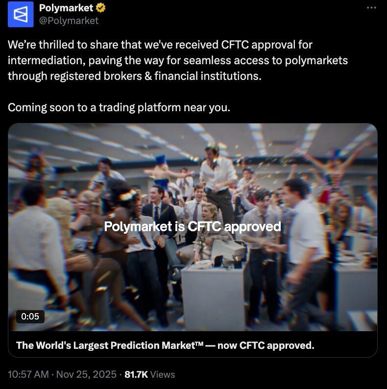Prediction platform Polymarket has received regulatory approval from the US Commodity Futures Trading Commission to operate an intermediated trading platform.