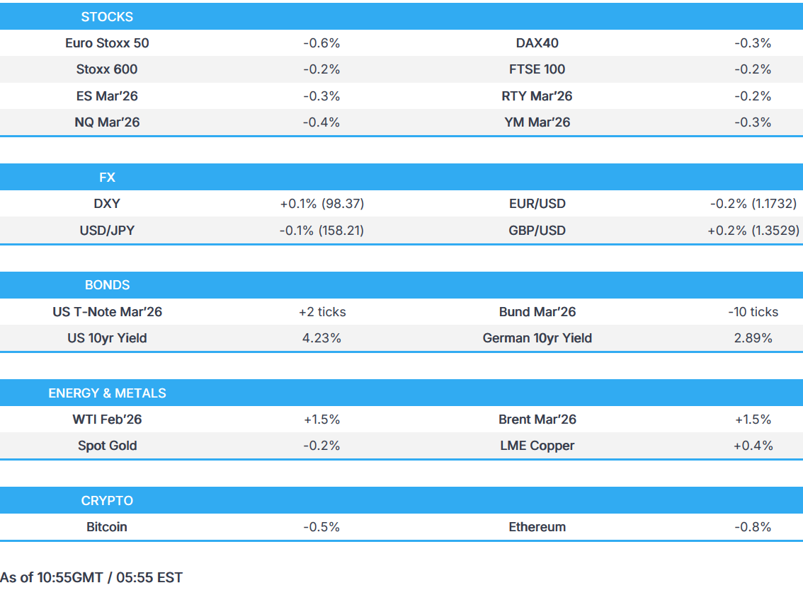 - European bourses and US equity futures are trading lower; NQ -0.4%.