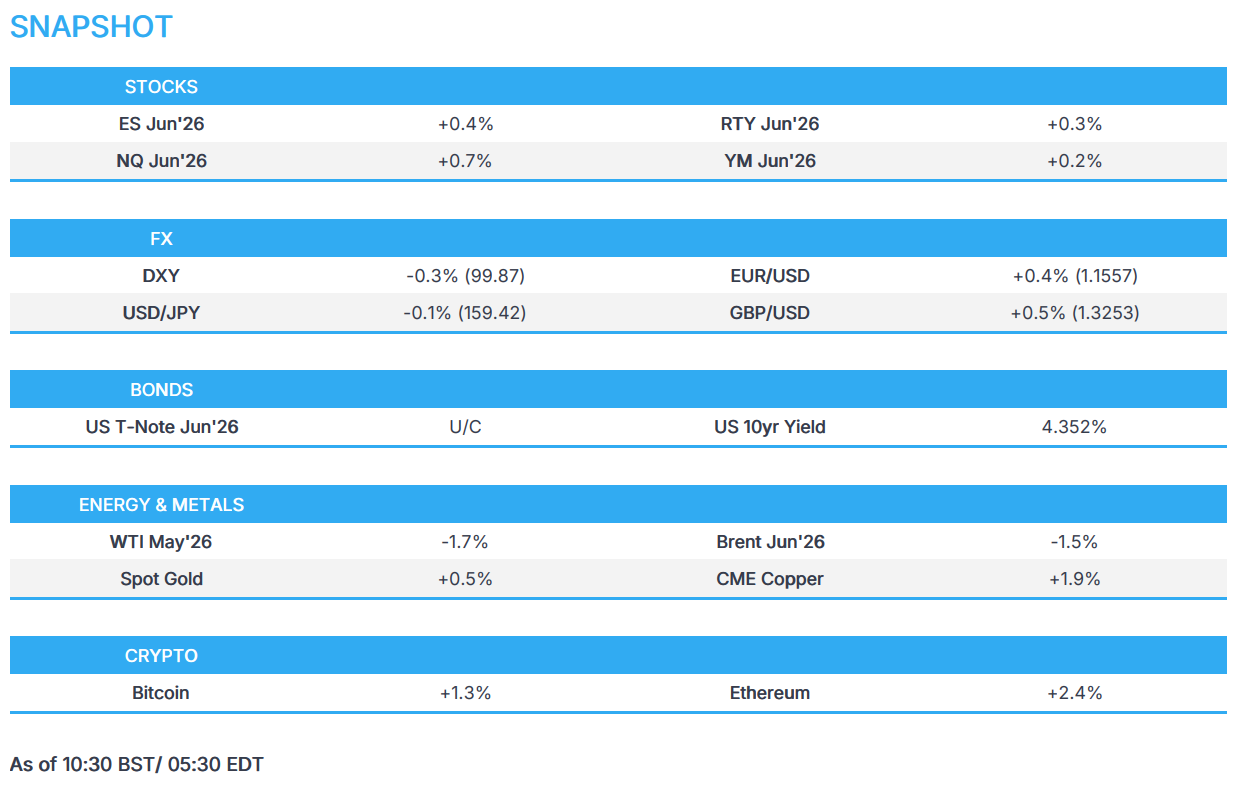 - US equity futures have benefited from the constructive risk mood as hopes of a US-Iran ceasefire brighten. Initial upside was seen following a Reuters source report, stating that the Pakistan Army Chief held separate calls with US VP Vance, Envoy Witkoff and Iran’s Araghchi.