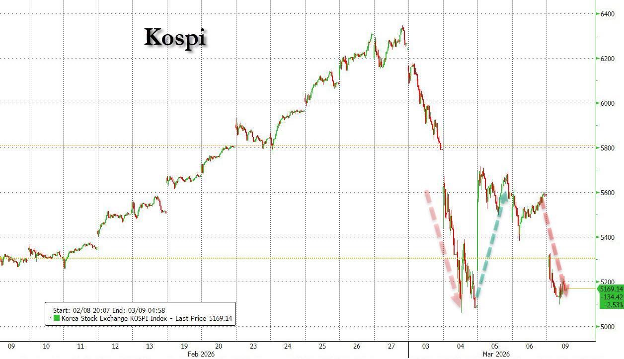 South Korean shares slumped 8% on Monday to activate circuit breakers for a second time this month on the escalating Middle East conflict, while the won dropped more than 1% to trade near a key psychological barrier of 1,500 per dollar. The Kospi plunged 12% last Wednesday before surging by 12% on Thursday.