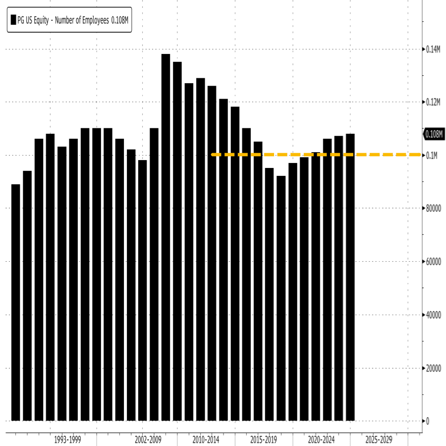 After the two-year restructuring plan is completed, Bloomberg data show that P&G's total workforce levels will return to 2018 levels, around 100,000.