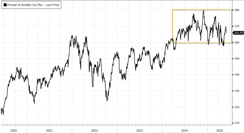 In markets, P&G shares are -1% year-to-date in New York. Zooming out to a five-year timeframe reveals choppy trading, with the stock oscillating between a $160 floor and a $180 ceiling since mid-2024.