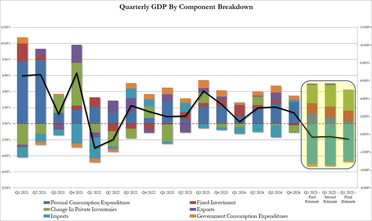 Of all the economic reports, the BEA's periodic update of US GDP is the most useless because not only is it politically motivated, but it gets constantly revised so much that by the time we get a somewhat accurate description of how strong the economy is, it is already one - if not two quarters - later. Today's second estimate of Q1 GDP - a quarter which ended almost two months ago - is just such an example.