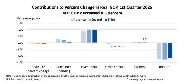 According to the BEA, GDP was revised down 0.3 percentage point from the second estimate, primarily reflecting downward revisions to consumer spending and exports that were partly offset by a downward revision to imports.