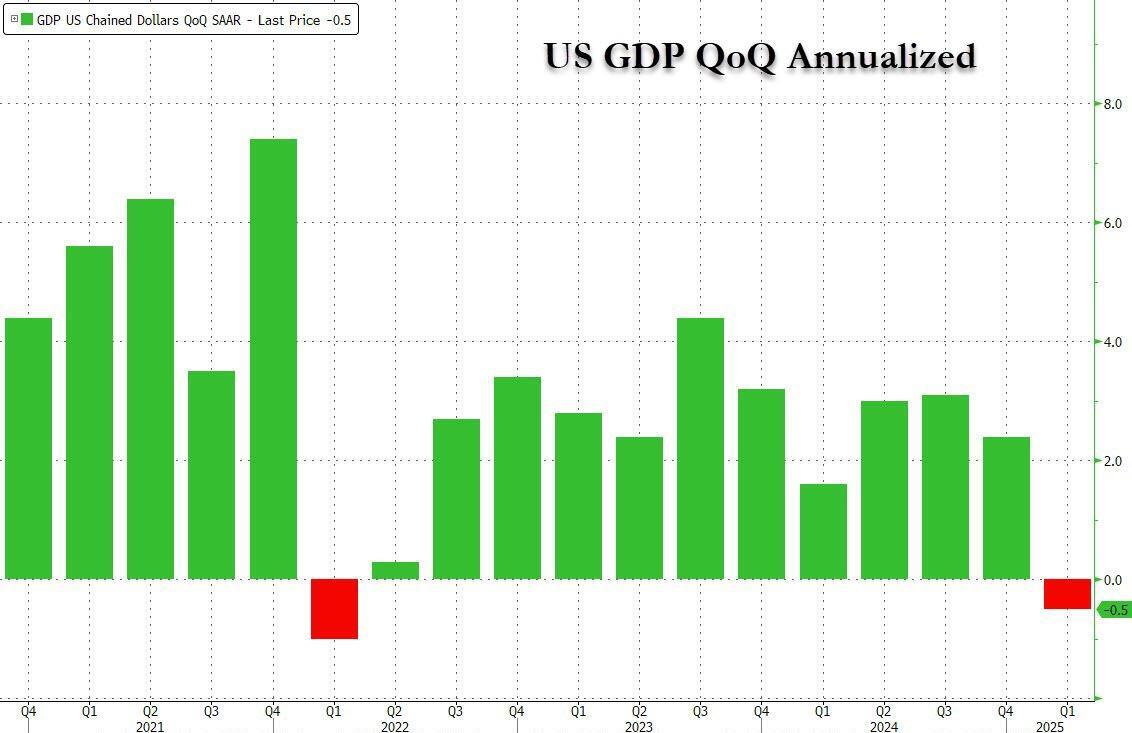 Moments ago the BEA reported that in Q1, US GDP shrank at a 0.5% annualized pace, a deterioration from the -0.2% first revision (which was also the median estimate), which in turn was an improvement from the -0.3% initial print;