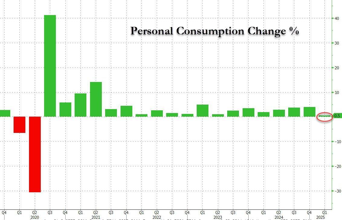 While there were few notable changes between the initial report and the first and second revision, the most notable one was in personal consumption which has continued to deteriorate, and was first cut by a third from 1.7% increase in the original print to 1.2% in the first revision, and today, to just 0.5%, making this the weakest quarter for personal spending since the covid crash.