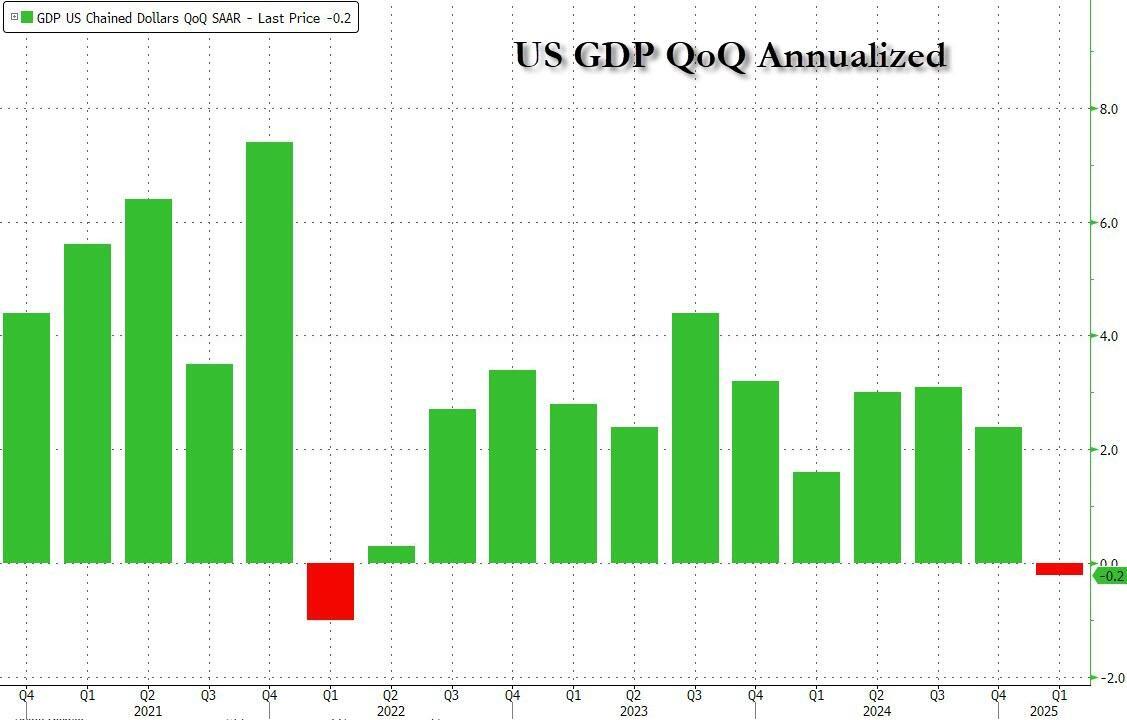 Moments ago the BEA reported that in Q1, US GDP shrank at a 0.2% annualized pace, a modest improvement from the -0.3% initial print which was also the median consensus.