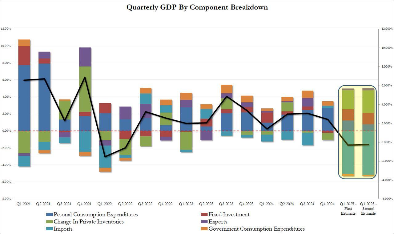 Overall, the report painted an uglier picture of the US economy in Q1, although it is likely a "kitchen sink" because in Q2 we expect that the bullwhip from the jump in imports (a boost to GDP) coupled with the deferred surge in personal consumption to propell Q2 GDP to 3% if not higher.