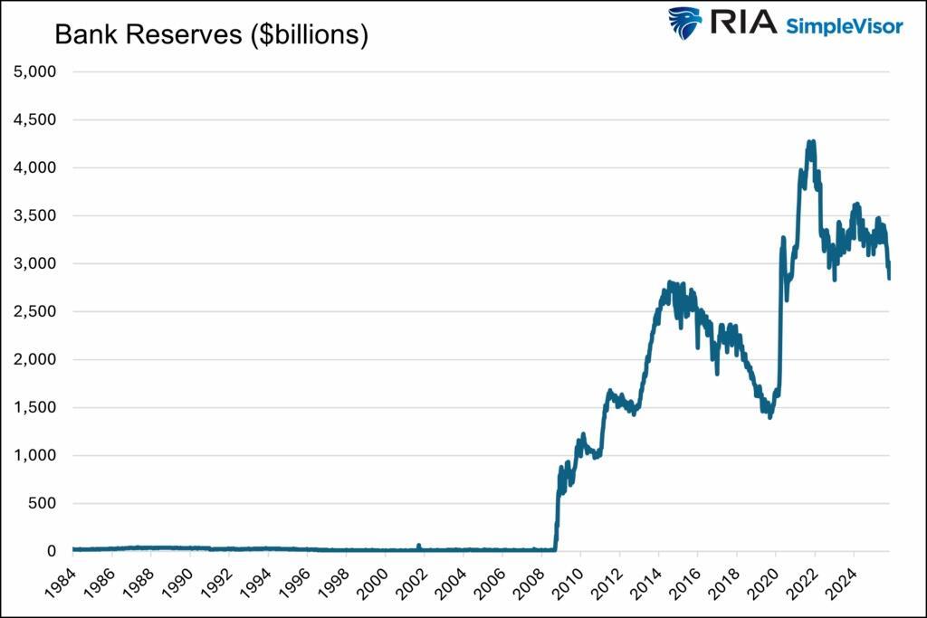 In 2008, the Fed introduced Quantitative Easing (QE). QE entails consistently purchasing securities regardless of liquidity conditions. Before QE, buying or selling was based on daily liquidity conditions. Because the Fed buys assets from banks with reserves, total reserves in the banking system have been grossly elevated since 2008.