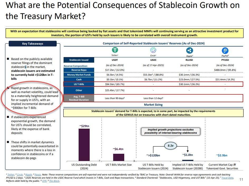 And the most notable highlight from the presentation: "Rapid growth in stablecoins, as well as market volatility, could lead to a materially heightened demand for or supply in USTs, with an implied incremental demand of ~$900bn for T-Bills."