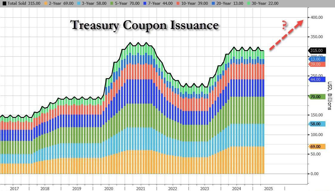 In our preview of today's quarterly refunding announcement we said to focus on three things: i) when will Treasury hike coupon sizes again, ii) if there will be any change to the language holding auction sizes steady for "at least" the next several quarters, and iii) will Bessent change the Treasury buyback program to a more activist exercise (similar to what Yellen did with her Activist Treasury Issuance strategy which boosted markets for 2 years as reverse repo drained). In retrospect, there were no big surprises, and in line with our forecast for $370BN in May gross offering, and $125BN in 3/10/30 quarterly refunding auctions...