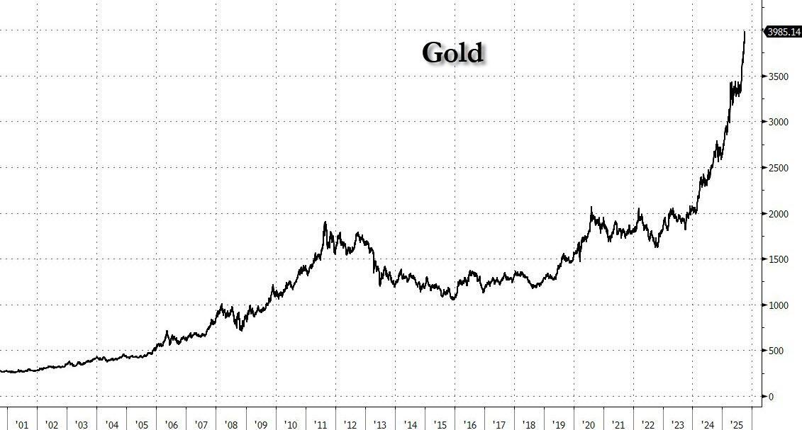 The Euro fell by 0.26% to 1.1711 while Sterling – presumably operating on the ‘least dirty shirt’ theory of comparative value (though, the British public finances and political apparatus are little better than the French) – rose slightly to close at 1.3485. The Dollar and gold were the big winners on Monday. The DXY index gained 0.39%, while gold rose another 1.92% to close at (another) all-time high of $3,960/oz and USDJPY gapped higher following news that Abe-acolyte Sanae Takaichi had won the LDP leadership race in Japan.