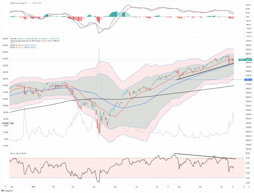 The S&P 500 ended Friday on a positive note, despite a weak open, at 6,664.01, rising roughly 0.5% and capping a volatile week. The Dow and Nasdaq posted similar gains, helped by a late-week rebound in financials and easing rhetoric on trade. While the bounce relieved some pressure, it followed a volatile trading week.