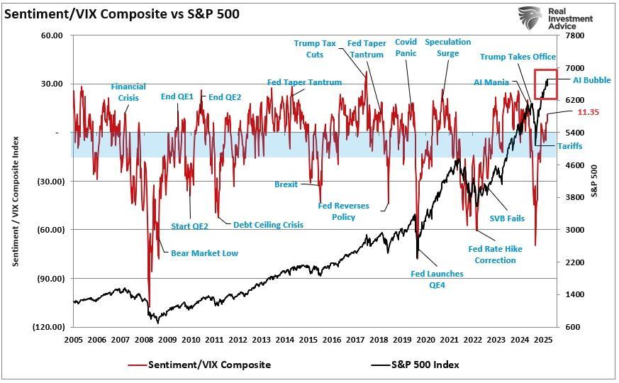 Investor sentiment is another warning sign. The latest AAII sentiment readings show that bullish sentiment is climbing, but many investors admit they lack conviction. A recent Charles Schwab survey shows more than half of traders believe the market is overvalued. This disconnect between belief and positioning often occurs near short-term market tops. Meanwhile, the IMF has warned about the potential for a disorderly market correction due to extended valuations and loose financial conditions. The chart below confirms that despite the market surge, the sentiment composite/VIX ratio suggests investors remain cautious.