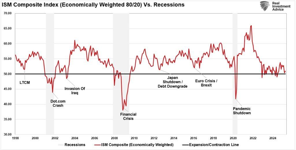With those tariffs vastly reduced, the risk of the recessionary impact from an excess “tax” on consumers is fading. However, even with the tariffs reversed, the economic data, while slowing, does not suggest that a recession risk is imminent.