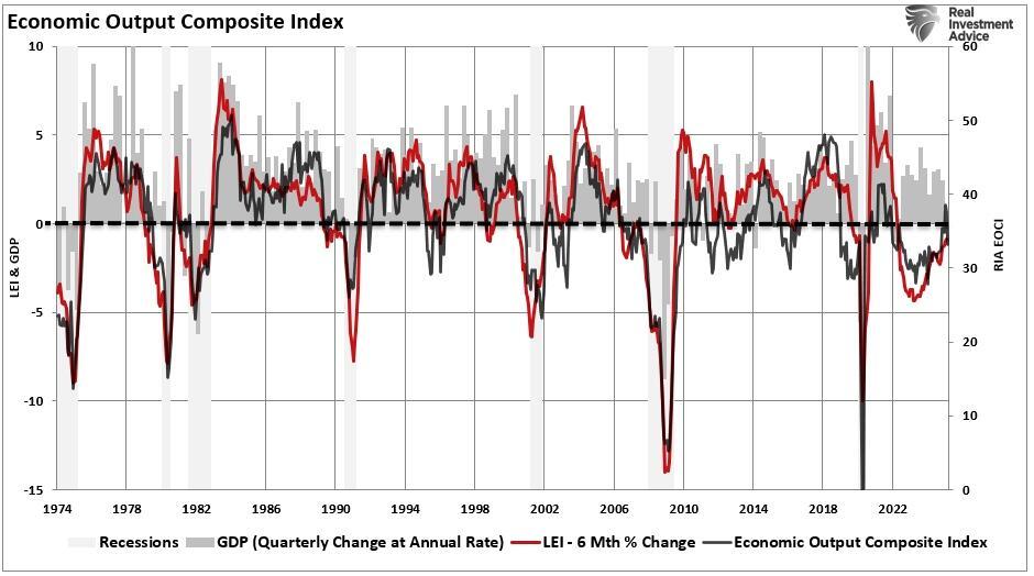 Currently, few indicators suggest recession probabilities are rising. The Economic Composite Index (a comprehensive measure of economic activity comprised of more than 100 data points) is in expansionary territory. The EOCI index confirms the improvement in the 6-month rate of change in the Leading Economic Index (LEI), one of the best recession indicators, and current levels of economic growth. While economic growth will undoubtedly slow as all of the excess governmental spending under the previous Administration reverses, there is currently no recession warning in the data. That does not mean that it can not change in the future. However, for now, the risk of recession is extremely low.