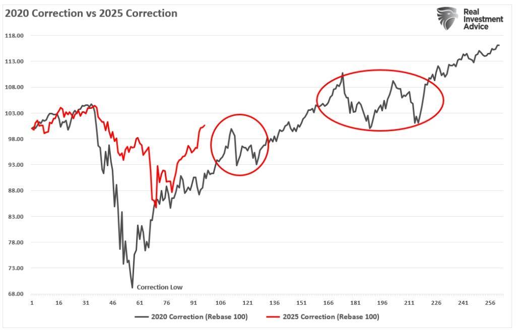 Given the reduction in tariff-related risk and stable economic data, we suspect the market will hold bullish support. That statement follows our analysis from earlier this week, which discussed whether we have returned to a bull market or if this is still a bear market rally. That analysis compared the current market advance to the 2022 corrective cycle. However, that article elicited quite a few comments about why the recent “tariff” sell-off could be like the 2020 COVID-pandemic decline and recovery. It’s a fair question and worth a few words.