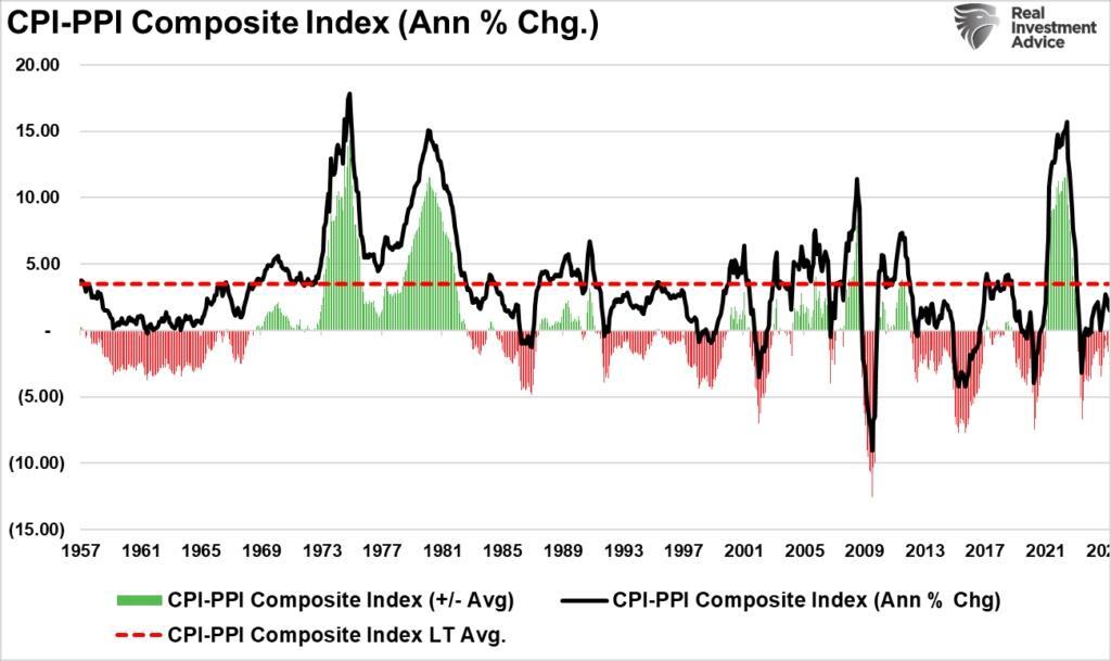 The reality is that the onerous tariff levels initiated by the Trump administration were never permanent. This was a mistaken assumption by the mainstream media. Furthermore, the “inflation impact” from tariffs, which was expected to cause the recession, has yet to appear. Such is evident in both inflation reports this past week. The chart below shows the composite CPI/PPI index and whether inflation is above or below the long-term average inflation rate. Currently, inflation is 2% below its long-term average.