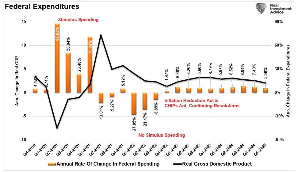 Furthermore, despite the hopes that DOGE would cut Federal spending, it has only returned to the post-financial crisis exponential growth trend as the Government continues to use “Continuing Resolutions” to fund the Government. These resolutions automatically increase government spending by 8% annually. In other words, spending doubles every nine years, so debt levels continue to rise, feeding into economic growth rates.