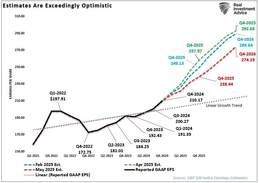 “Given the slowdown in economic growth rates, it is unsurprising that, as of May 1st, S&P Global finally acquiesced and revised earnings estimates lower. However, this wasn’t a mild earnings revision but a slashing of estimates from their April 15th expectation of $292/share in 2026 to just $274. Furthermore, full-year 2025 reported earnings estimates were cut by nearly $20/share from $258/share to just $238/share.”