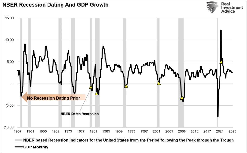 The problem with predicting recessions is that economists always work off lagging economic data. Such is particularly the case with GDP, which is revised three times following the end of the quarter, 12 months, and 3 years later. Historically, given that lag, the timing of U.S. recessions can be off by 9 to 12 months before they are recognized by the National Bureau of Economic Research (NBER). The chart below shows the lag between the onset and recognition of previous U.S. recessions.