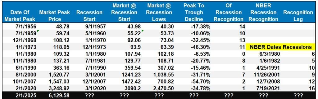 The following table better shows the lag between the start and recognition of previous U.S. recessions. I have also noted the impact on financial markets as investors reprice earnings growth for a reversal in economic growth rates.