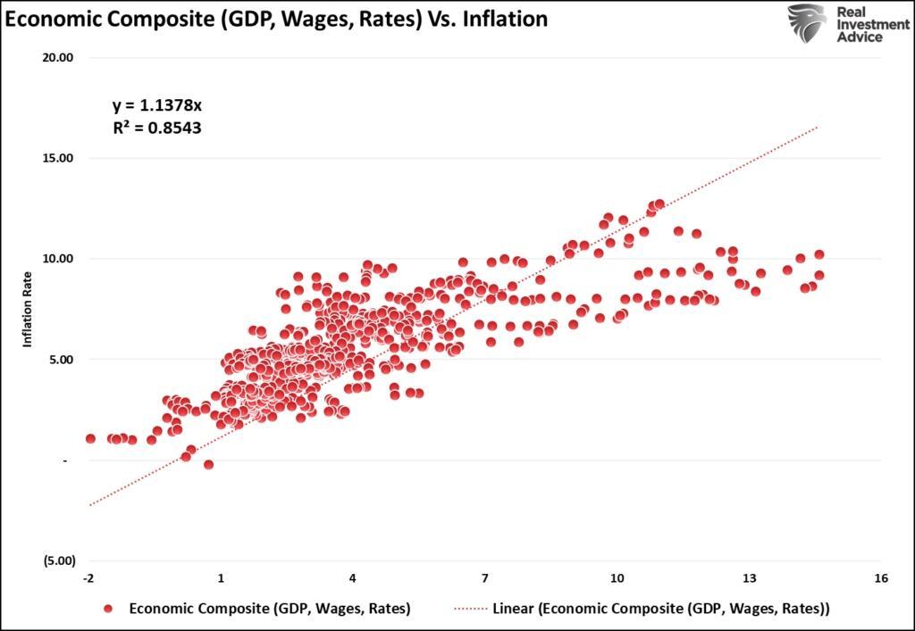 “The current data point toward a recessionary risk. Deflation is highly correlated to economic growth rates, wages, and rates. Unsurprisingly, recessions reduce inflation as demand for goods and services collapses. While inflation may be “sticky,” the recent decline in bond yields and wages suggests consumer demand will decline this year. When tariffs, an additional tax on consumers, increase the cost burden, the reaction historically is not expansionary.”