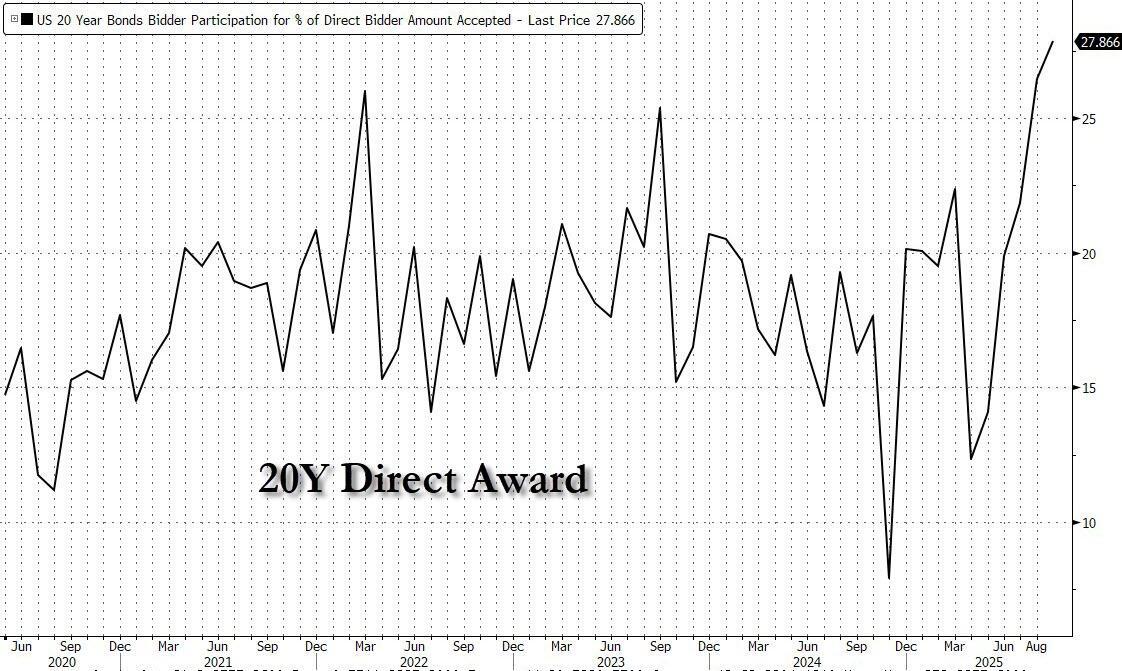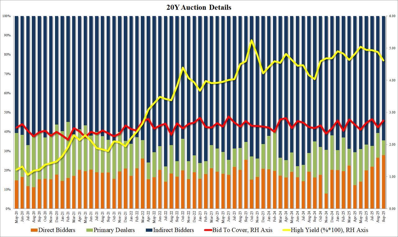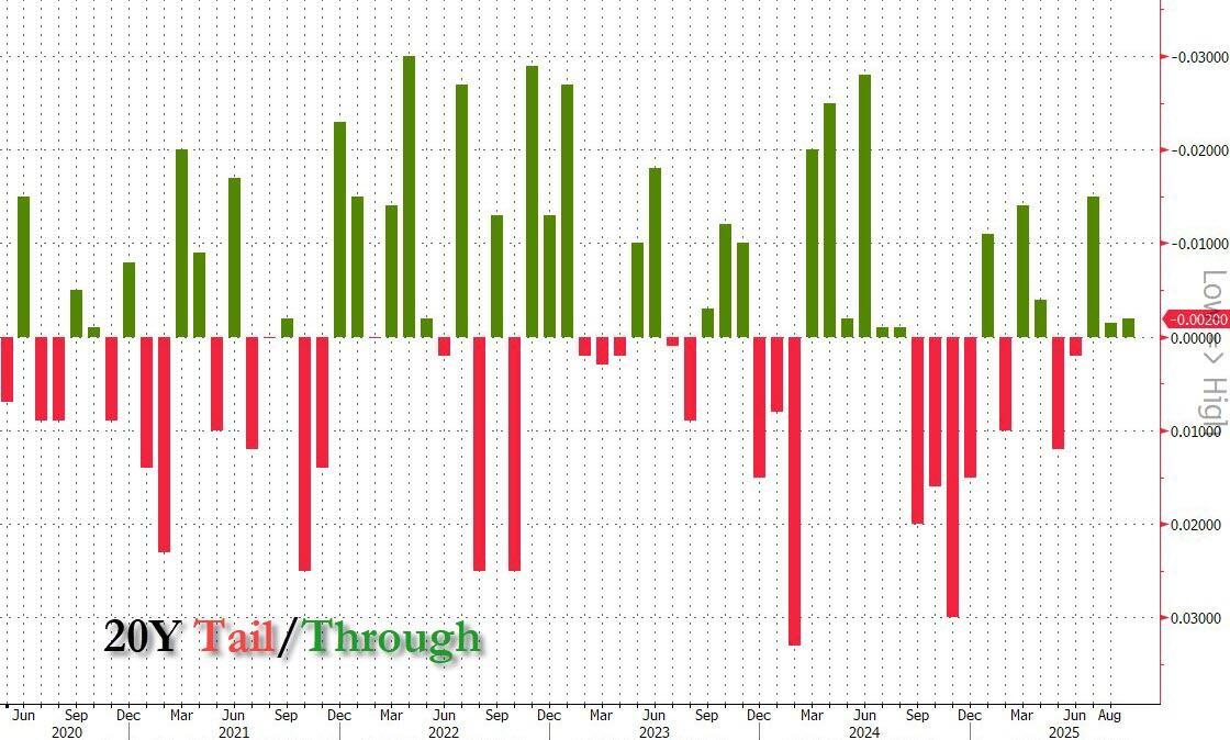 After 3 stellar coupon auctions last week, with 10Y yields trading effectively at the lowest level since last October (excluding the Liberation Day basis trade freak out) , and with the Fed set to cut by at least 25bps, there was little anxiety ahead of today's 20Y coupon auction. And with good reason: moments ago the day's coupon auction, a reopening of the 19-Year, 11-Month cusip UN6, went without a glitch in what was a very solid auction.