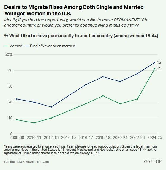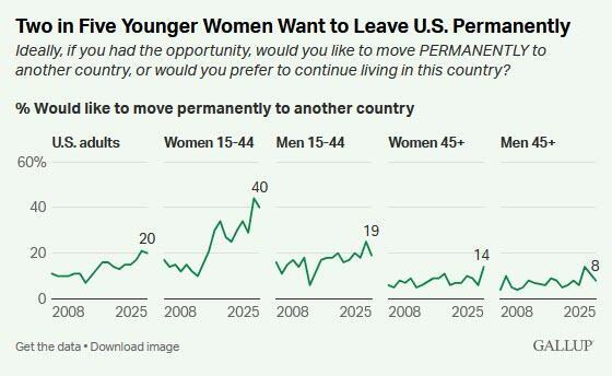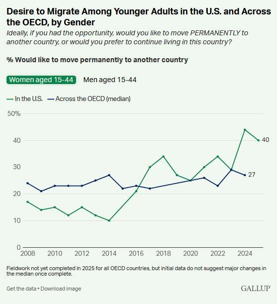 Gallup’s question asks about desire to migrate, so these findings reflect aspirations rather than intentions. Previous Gallup research shows not everyone who wants to move will move. Still, the data indicate that millions of younger American women are increasingly imagining their futures elsewhere.
