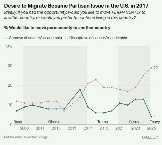 Rising interest in leaving the U.S. is shaped not only by age and gender but also by political attitudes. In 2025, there is a 25-point gap in the desire to migrate between Americans who approve and those who disapprove of the country’s leadership.