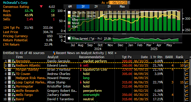 Lewis now stands alone among the 41 analysts tracked by Bloomberg with a bearish stance on McDonald's. He set a Street-low price target of $260, well below the $332 average and the stock's most recent close of $304.78.