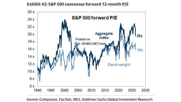 Goldman’s own scenario analysis puts a moderate slowdown path at 6,300 on the S&P 500 and a severe oil-shock path as low as 5,400. Neither of those scenarios is priced into current earnings estimates. S&P 500 companies are still being modeled at roughly $309 per share in earnings for 2026, figures built on assumptions about GDP growth and energy costs that the past eight weeks have materially challenged. When earnings revisions begin in earnest, they tend to hit in waves. We’re likely in the early innings of that process, and it will impact forward returns. The reason is that the market trades off forward earnings expectations; if those expectations fall, the market reprices for lower earnings growth.