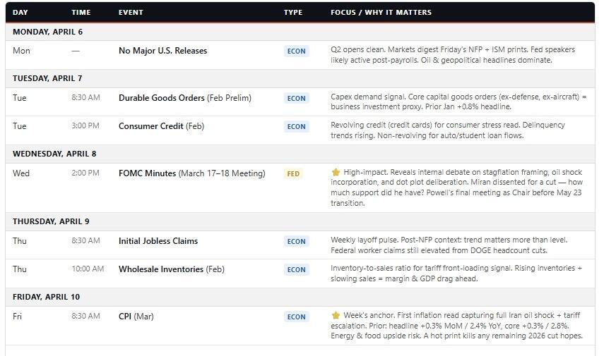 The first full week of Q2 is book-ended by two events that will define the rate narrative for the next two months: the FOMC Minutes on Wednesday and March CPI on Friday. Everything else is secondary, other than what oil prices are doing.