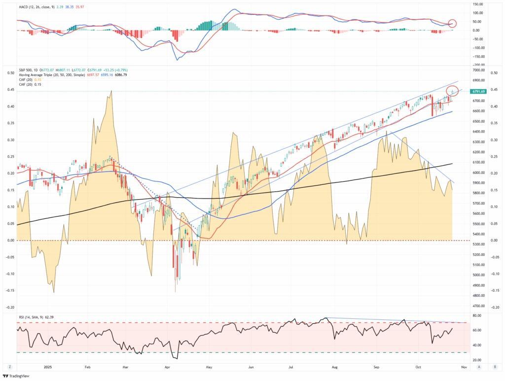 The S&P 500 closed Friday at a record 6,753, confirming a breakout above the previous resistance and setting all-time highs. That breakout vindicated the bulls after a successful test of the 50-DMA support level previously. Furthermore, the market reclaimed the rising bullish trend line from the “Liberation Day” lows and triggered a momentum (MACD) “buy signal, confirming that the bullish bias remains intact. Moving averages also continue to trend higher, reinforcing the overall bullish setup.