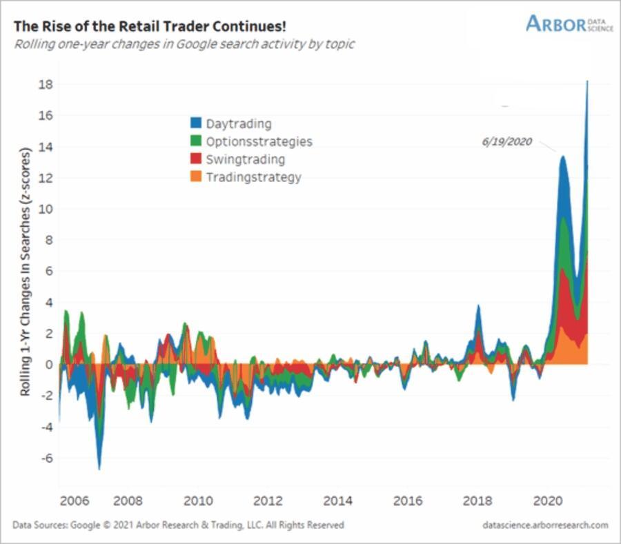 “In a “market mania,” retail investors are generally “long confidence” and “short experience” as the bubble inflates. While we often believe each ‘time’ is different, it rarely is. It is only the outcomes that are inevitably the same. A recent UBS survey revealed some fascinating insights about retail traders and the current speculation level in the market. The number of individuals searching “google” for how to “trade stocks has spiked since the pandemic lows.”